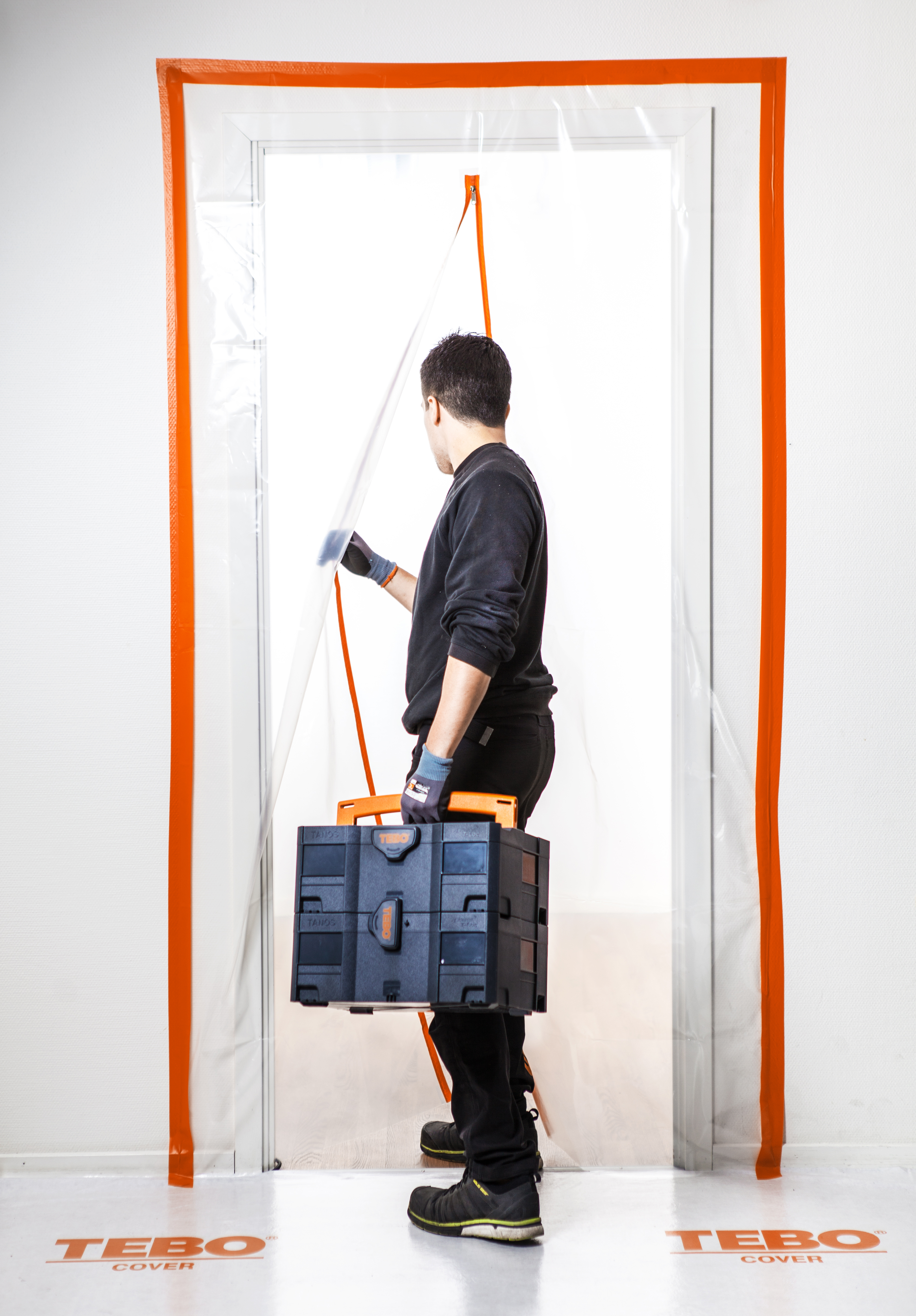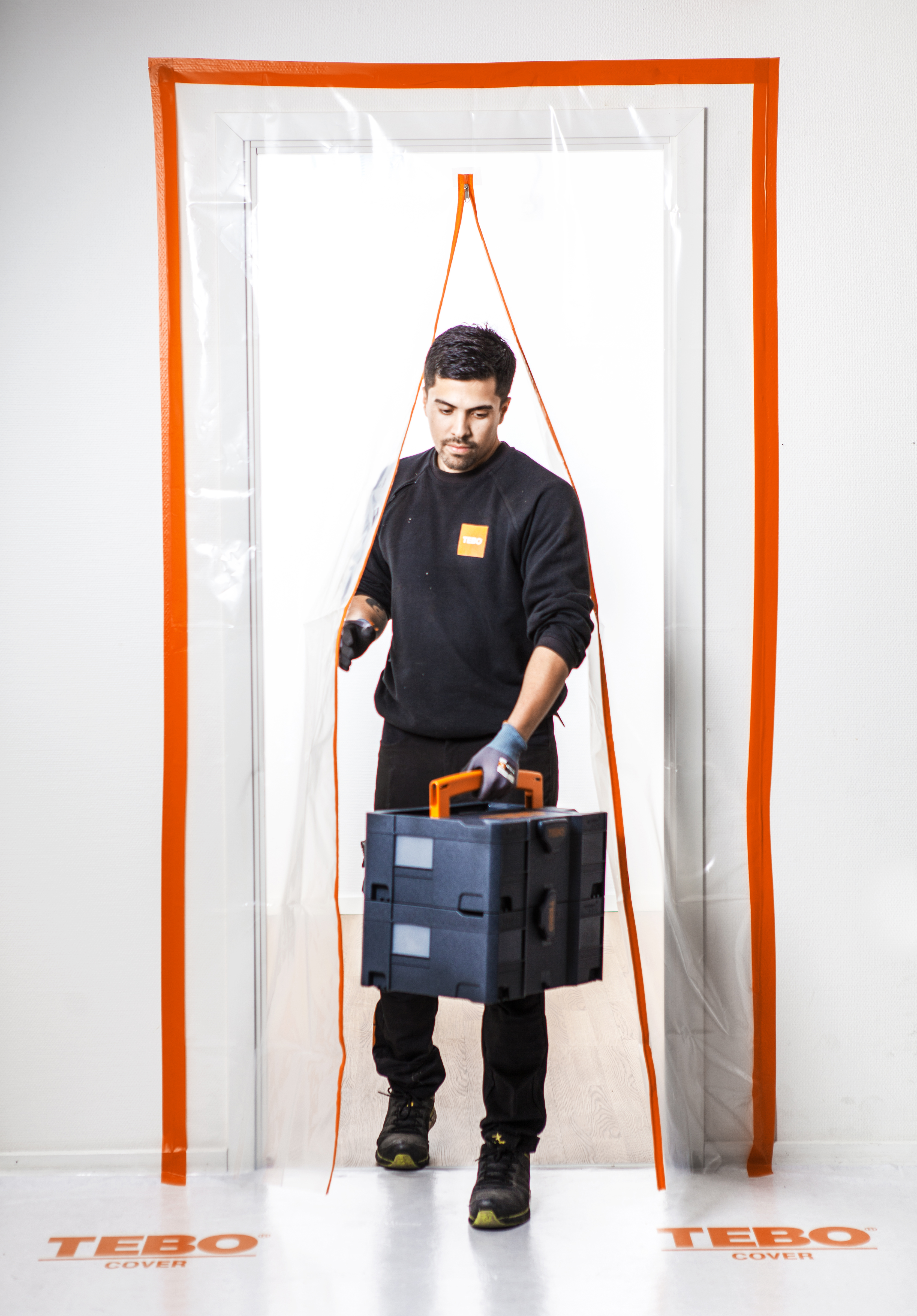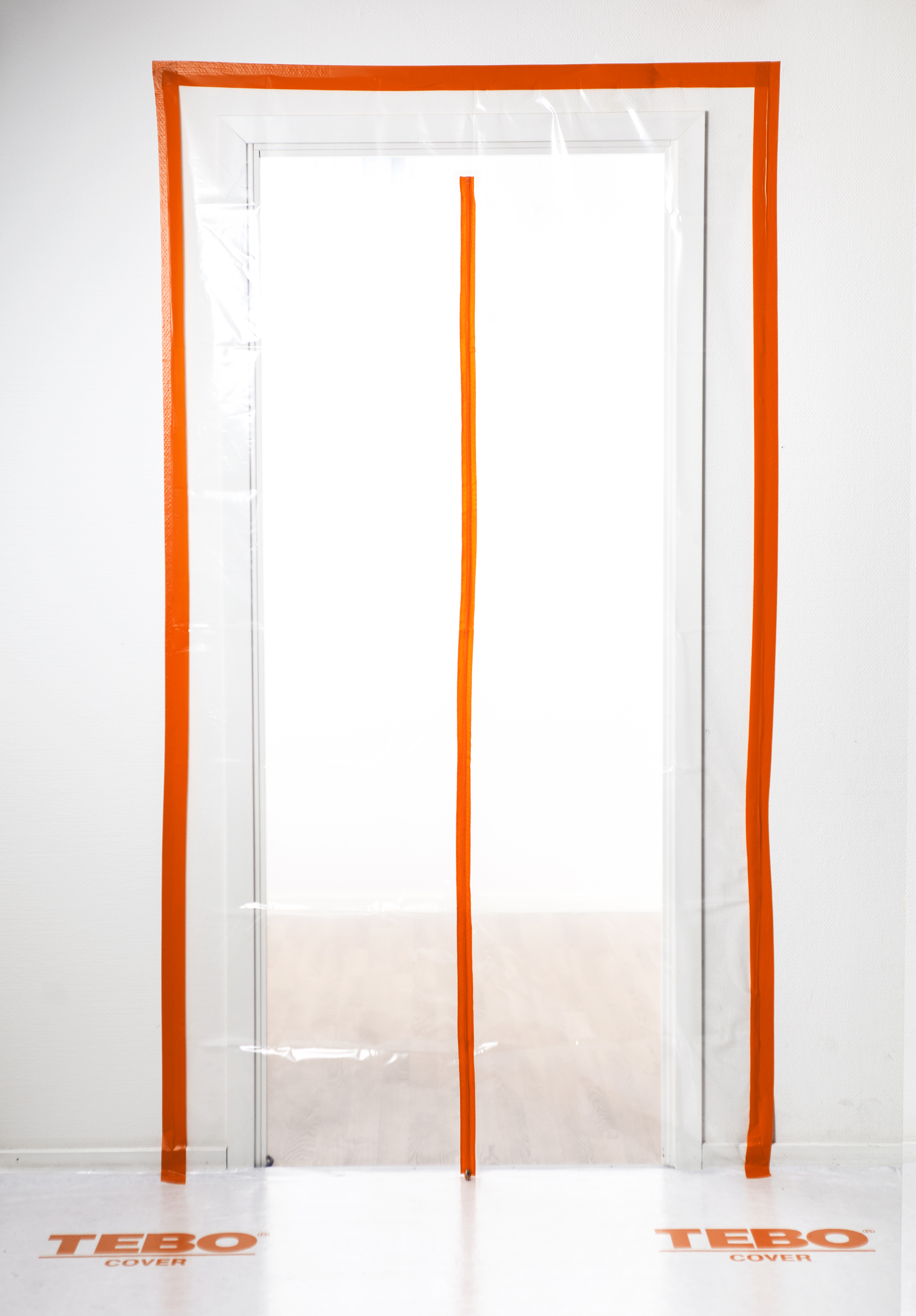 Enkel och flexibel plastfilm med dragkedja för att täcka t.ex. dörröppningar vid renoveringar.