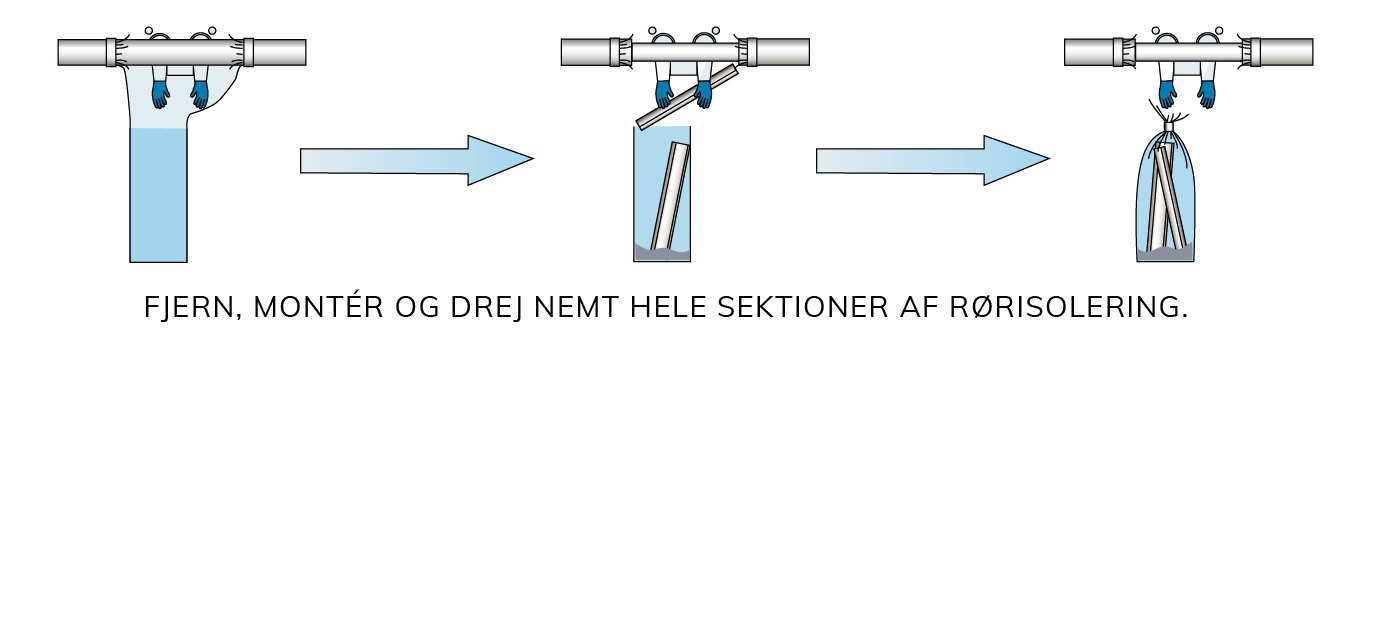 De medföljande latexhandskarna bildar en luft- och vätsketät barriär som effektivt förhindrar läckage av asbestpartiklar. När avfallet har samlats upp i påsen kan den enkelt stängas genom att vrida ihop toppen och förseglas med tejp. Detta säkerställer att farliga fibrer förblir inneslutna.