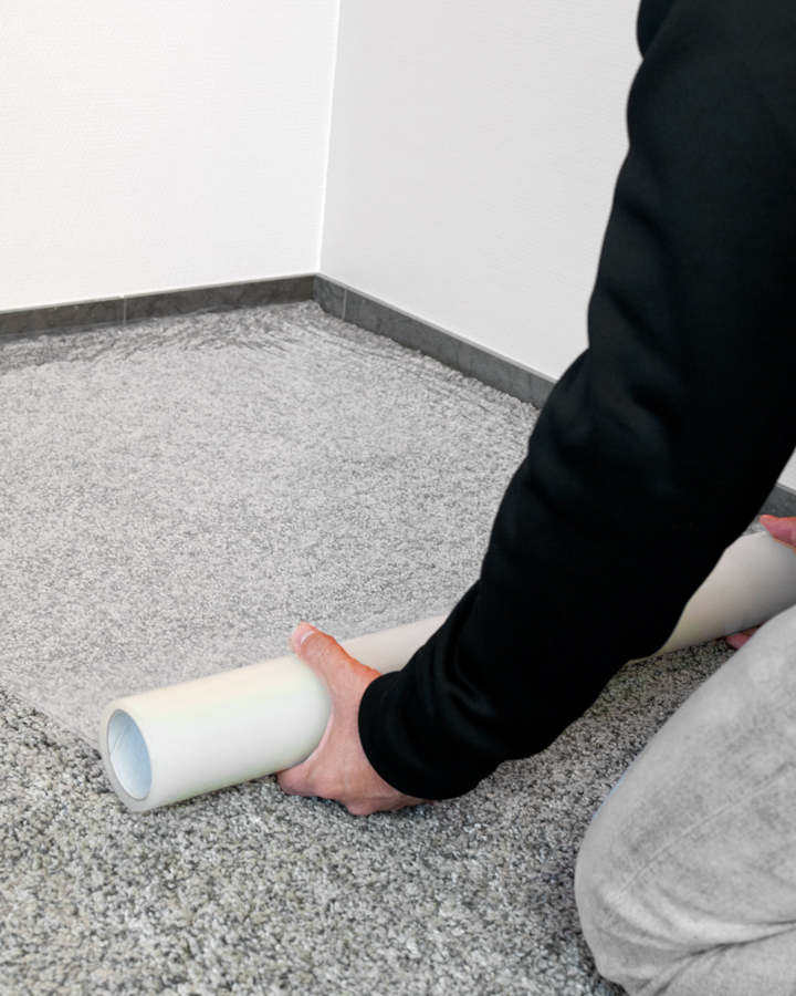 Denna skyddsfilm är tillverkad av PE-plast och är lämplig för mjuka ytor som heltäckningsmattor (rekommenderas dock inte för ull- eller långluggiga mattor). Den självhäftande ytan gör den enkel att rulla ut och installera.