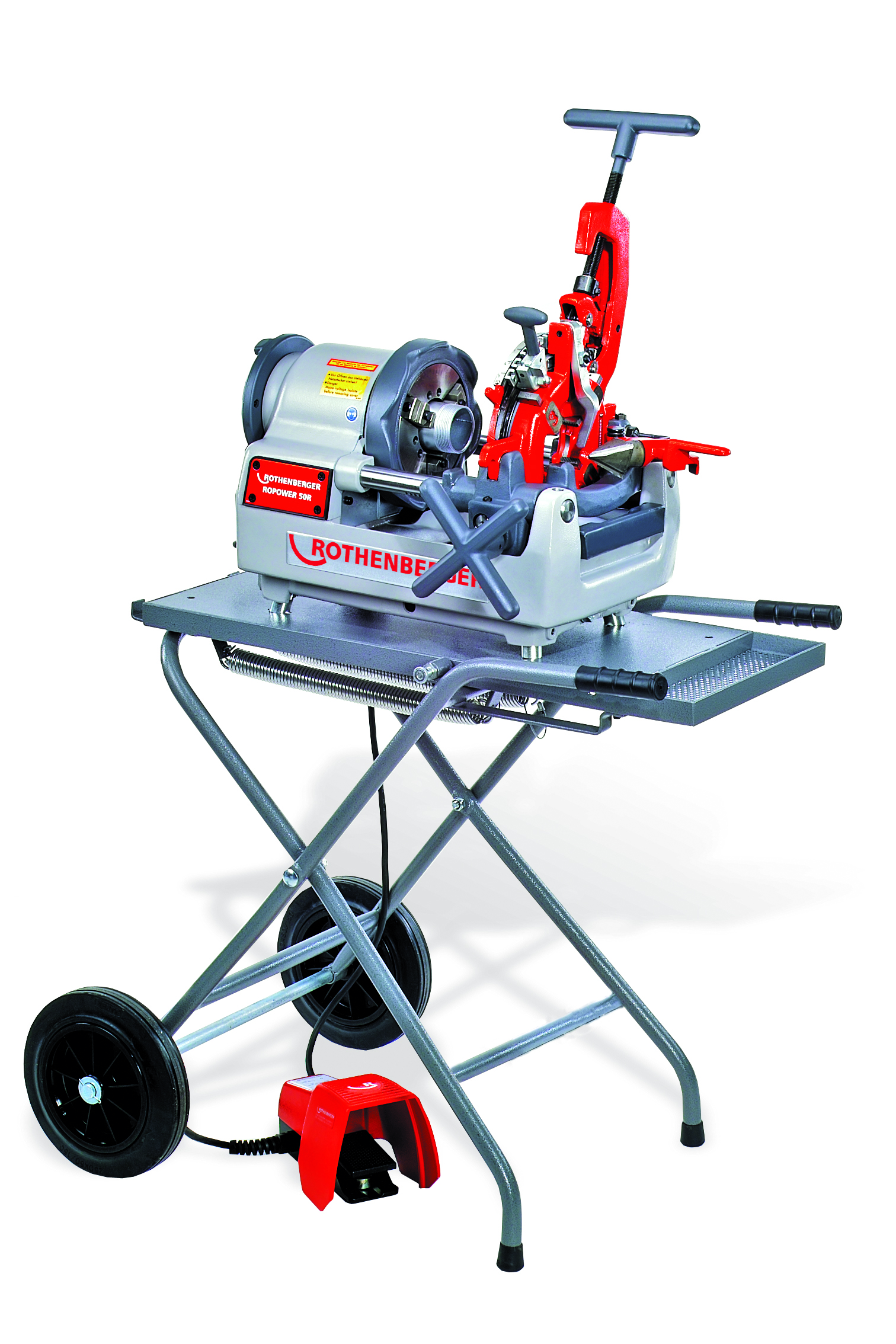 Gängskärmaskin med automatiskt skärhuvud Ø 1/2” – 2” och fotpedal. Hopfällbart stativ som kan användas som arbetsbänk och är lätt att transportera på hjul.