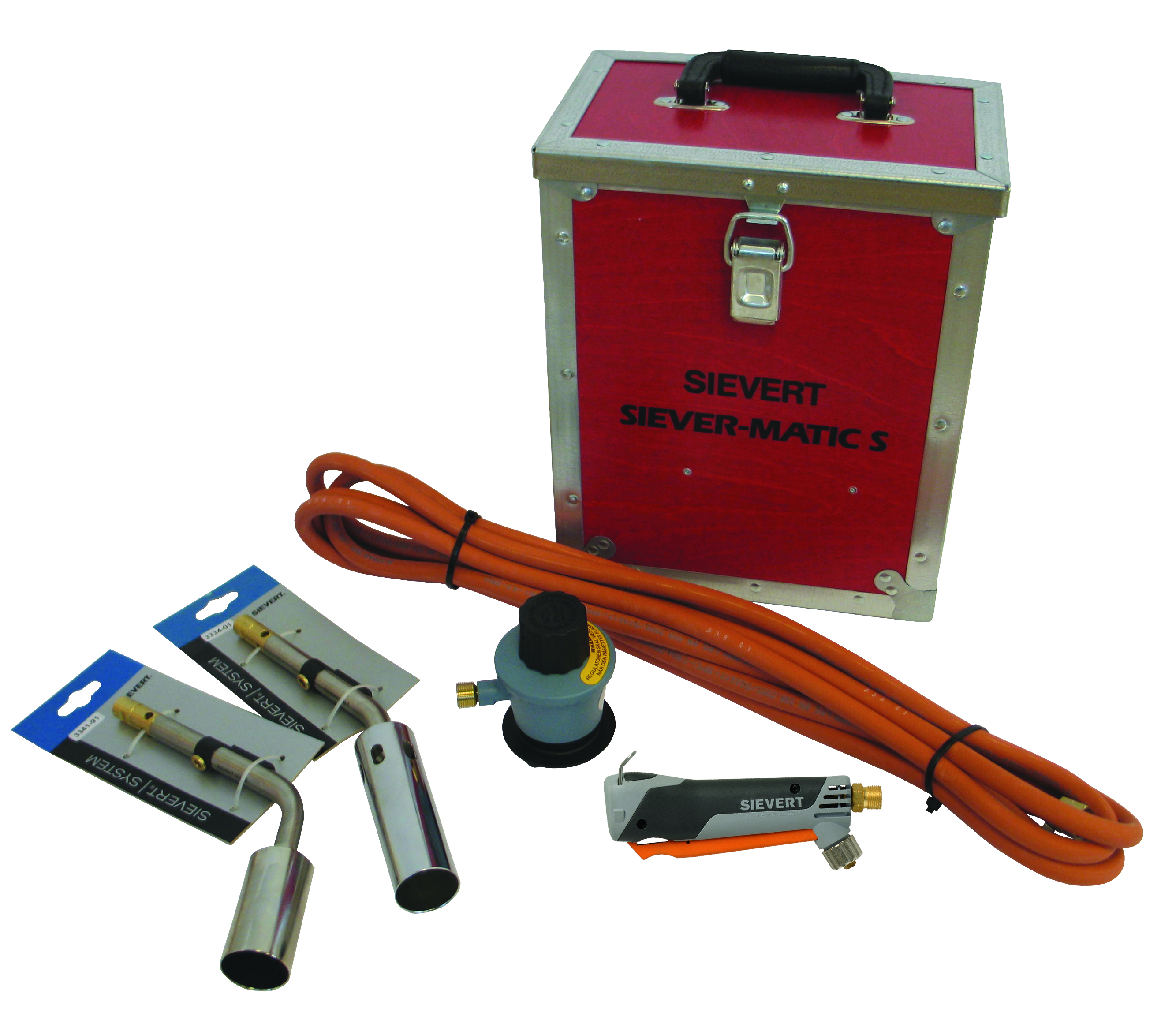 Sievert Promatic S krympsats. Teleinstallationssats. Bestående av: Handtag (3366), varmluftsbrännare Ø38 (3334), mjuklågbrännare Ø38 (3341), mjuklågbrännare Ø28 (3347), högtrycksregulator (3066), 4 m HT-gasslang med kopplingar (22603-04), verktygslåda (720100).
