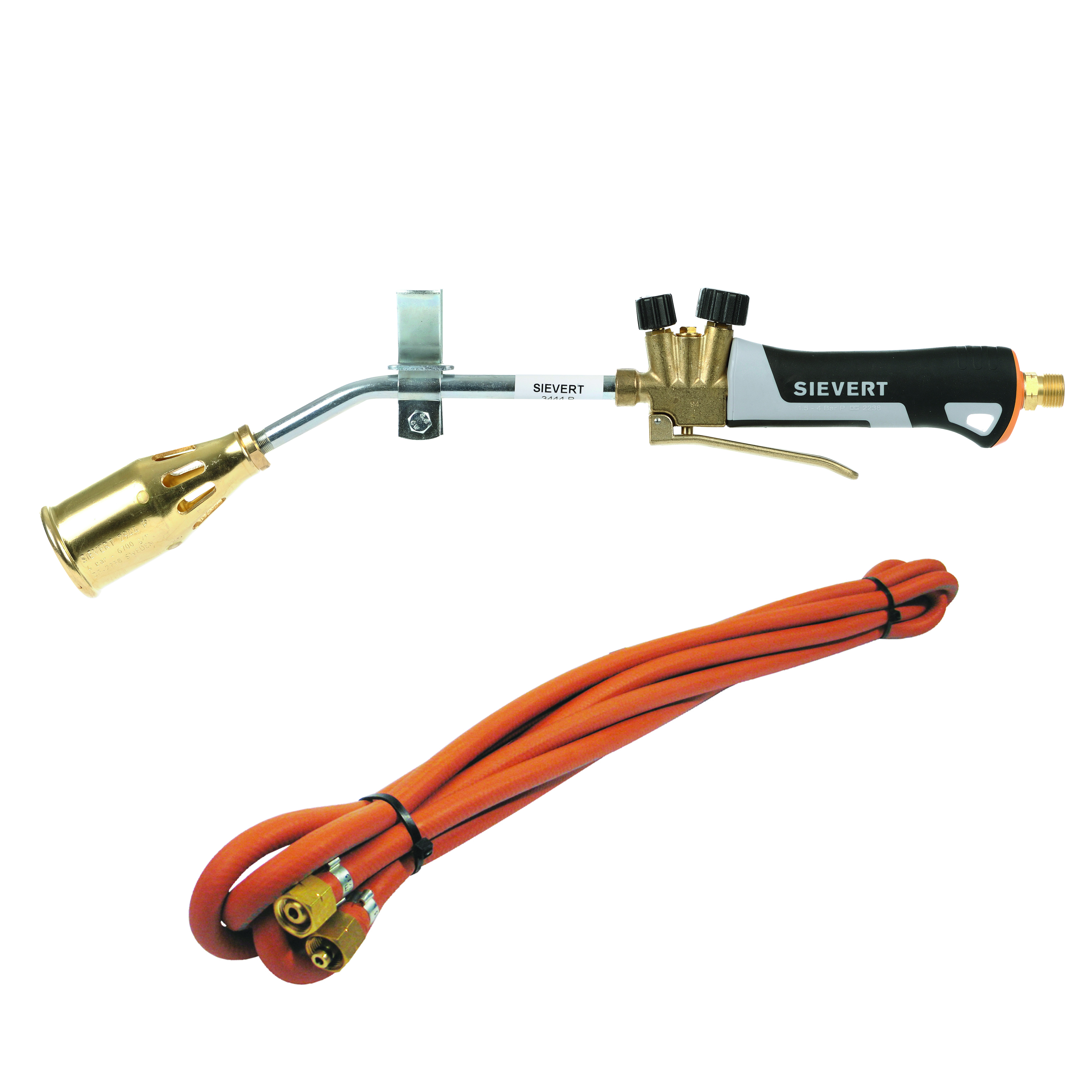 Sievert takbrännarset kort modell med 5 m slang. Pro 88 handtag med 180 mm halsrör och Ø50 mm brännare. Innehåller Turbo takbrännarset med 5 m slang, Högtrycksgasslang 6,3 mm utan kopplingar, Slangnippel med mutter 3/8LH, Slangnippel med svivel 3/8LH och Slan
