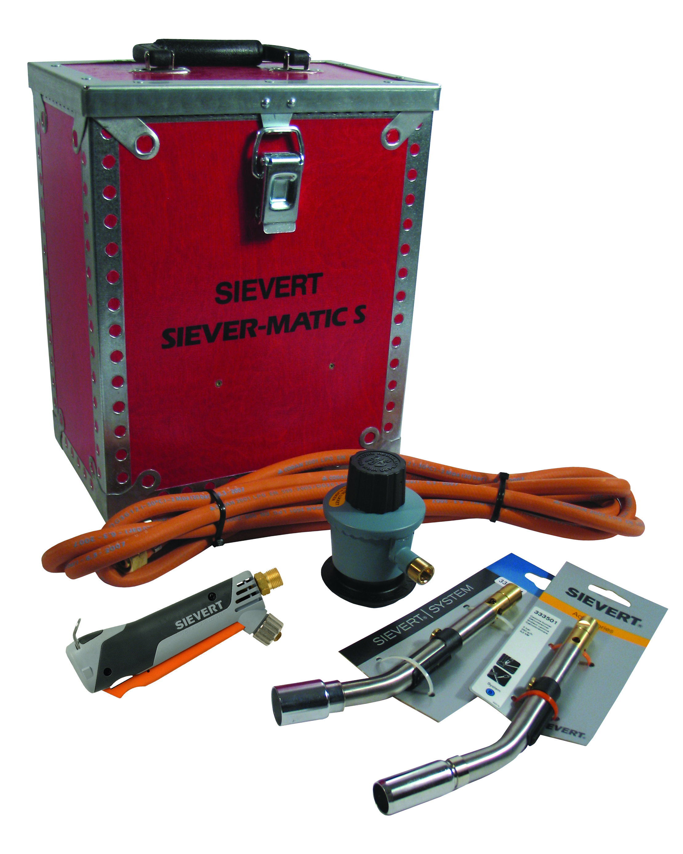 Bestående av: Handtag (3366), cyklonbrännare Ø19 (3335), lödbrännare Ø25 (3344), högtrycksregulator (3066), 4 m högtrycksgasslang (33603-04), verktygslåda (720100