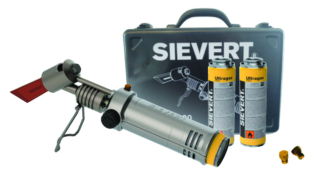 Bärbar lödkolv i titan och aluminium från Sievert för montering av gasbehållare i det ergonomiska handtaget. Lämplig för plåtarbeten och VVS-arbeten.