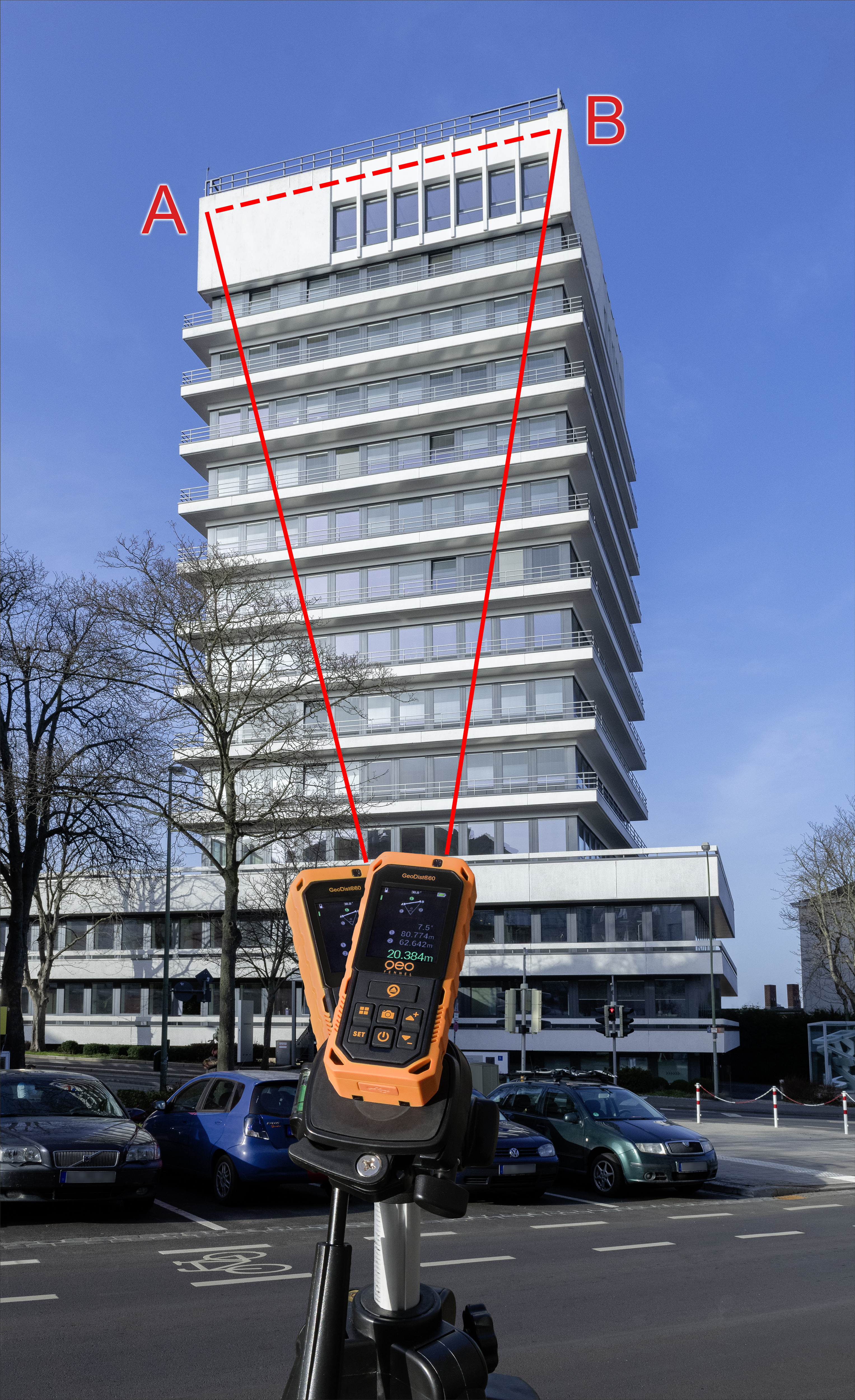När avståndsmätaren monteras på ett stativ med ¼-tums gänga är det möjligt att göra indirekta mätningar och få avstånd mellan två punkter – t.ex. takytan på ett hus.