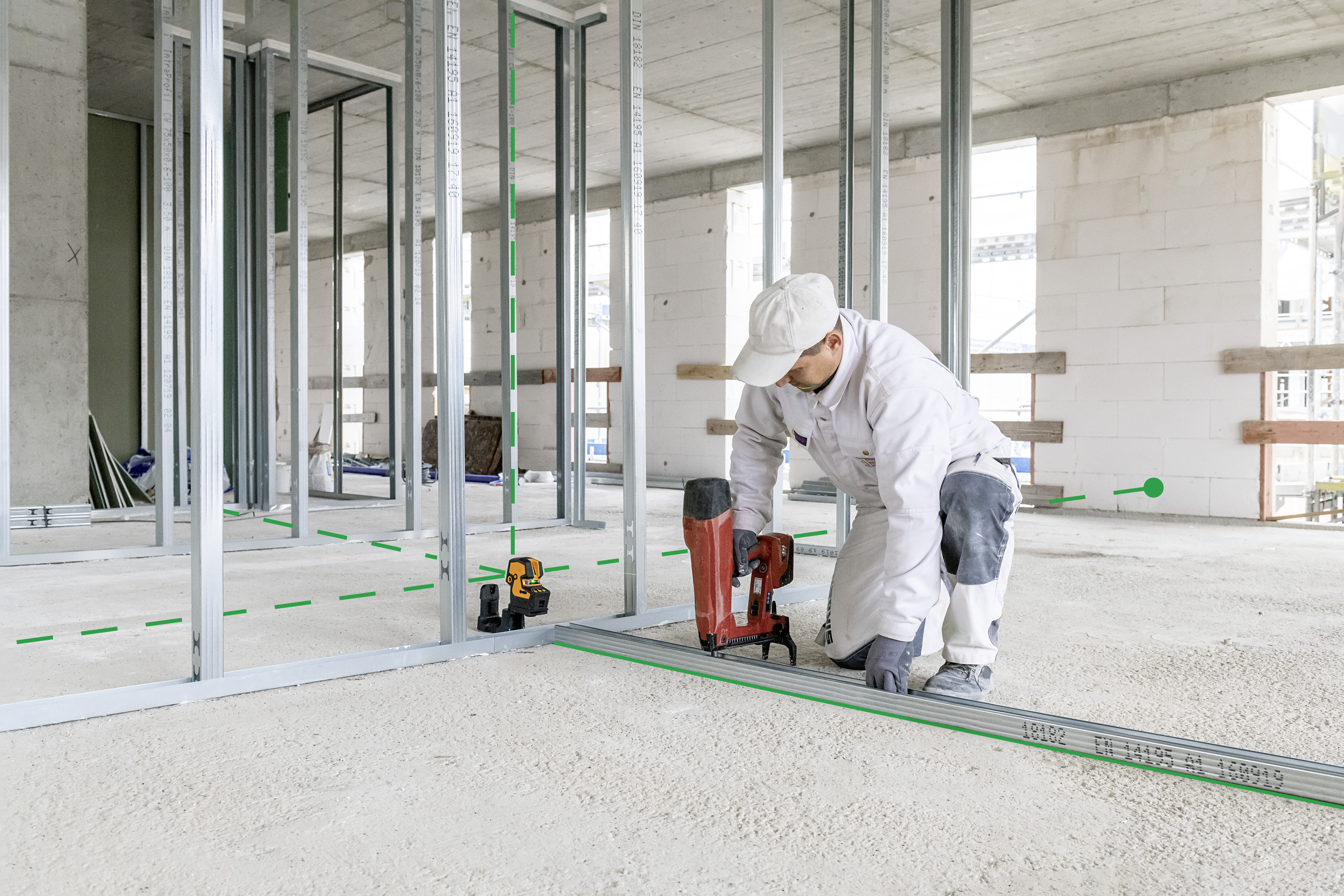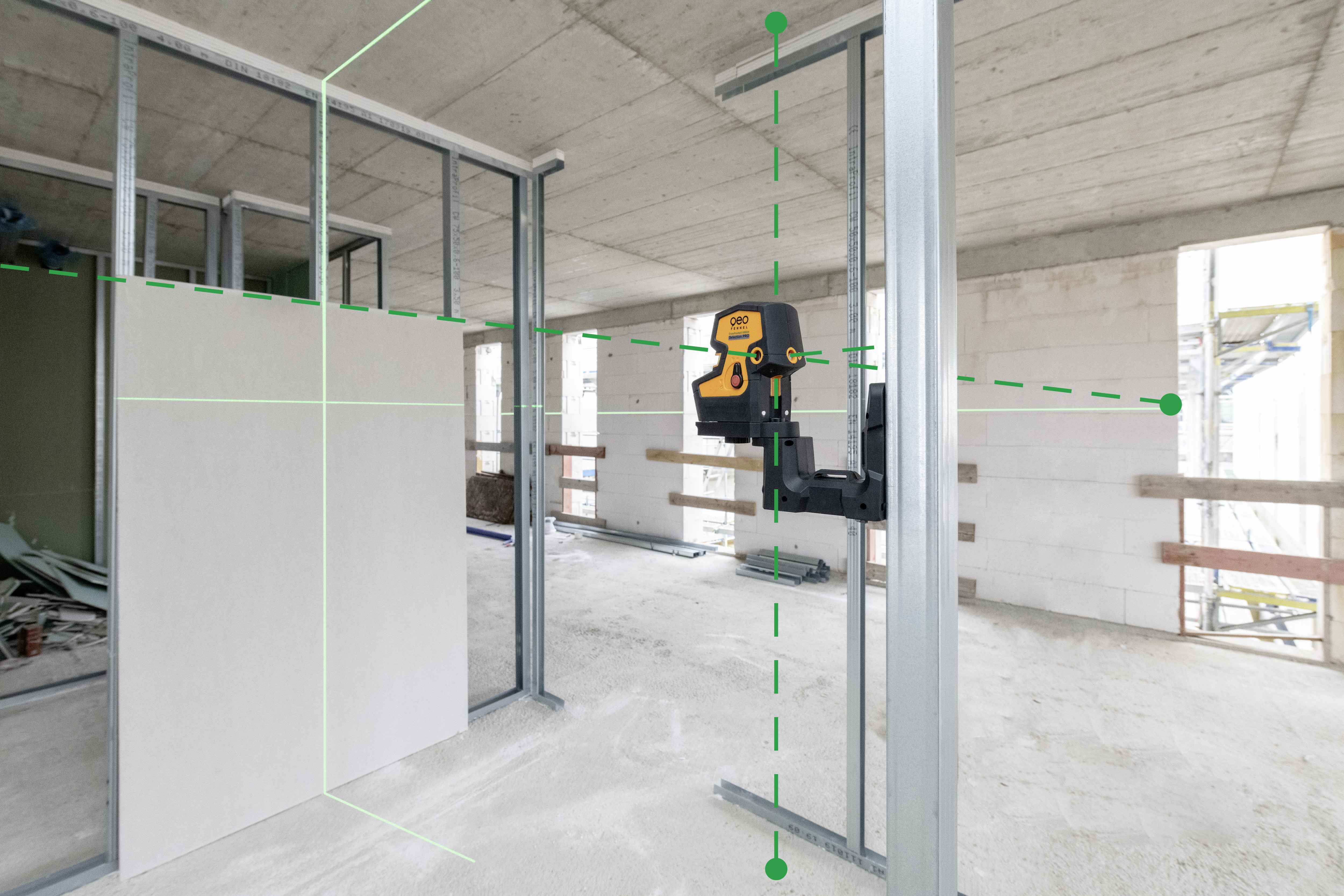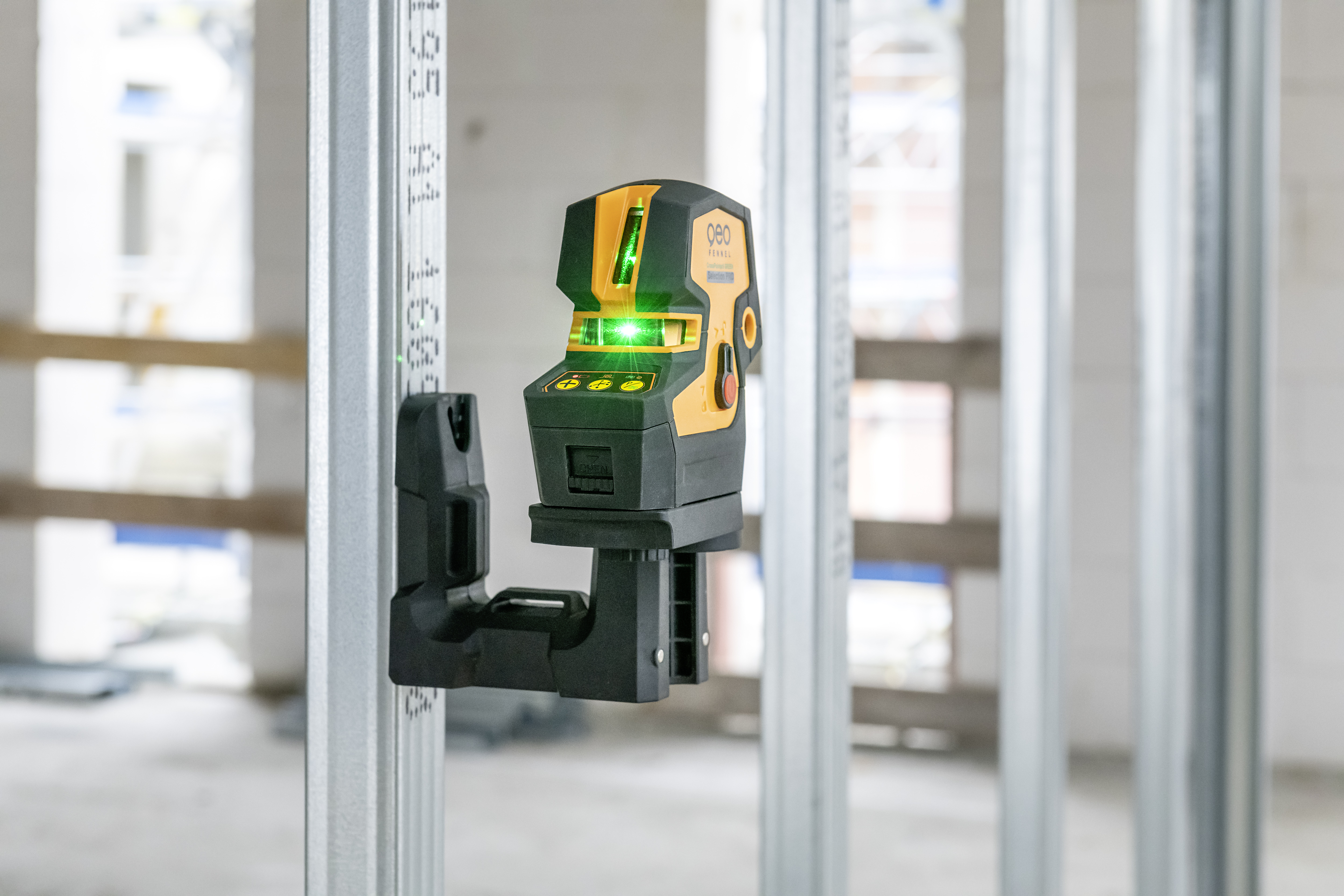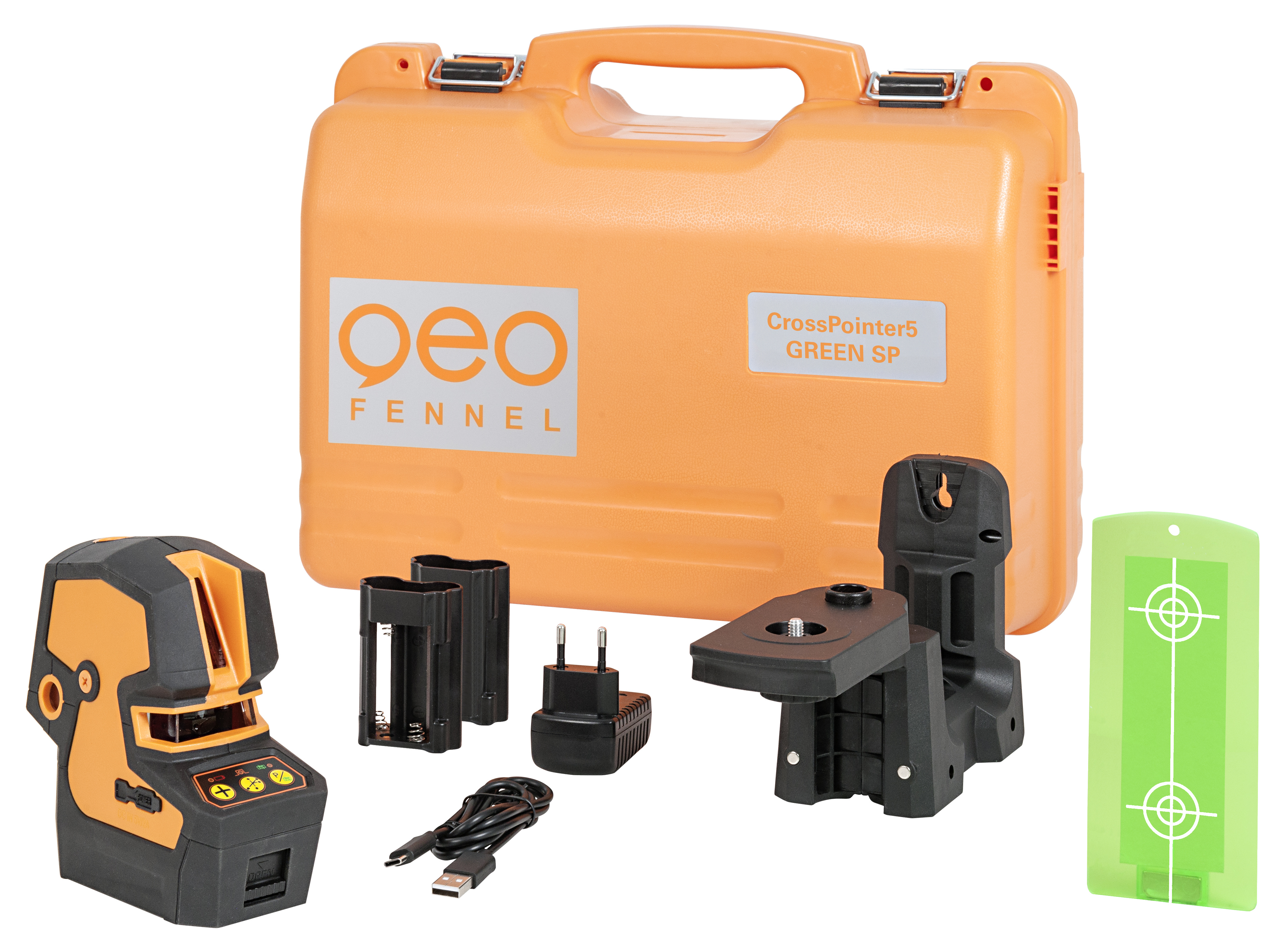 Grön självnivellerande punkt-/korslaser. 5-punktslaser: 1 punkt nedåt, 1 uppåt, 3 horisontella. Korslaser: 1 horisontell linje som täcker ett område på 180° och 1 vertikal linje som korsar den uppåtgående punkten som täcker ett område på 160°. Lämplig för uppsättning av skiljeväggar och undertak, vertikal punktförflyttning, vägg- och golvplattning, allmänt snickeri och 90° gering.