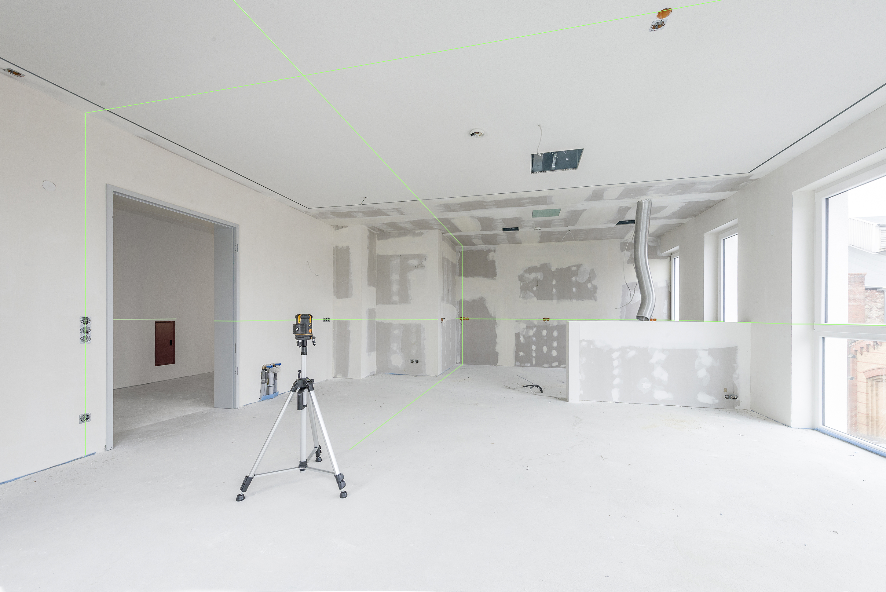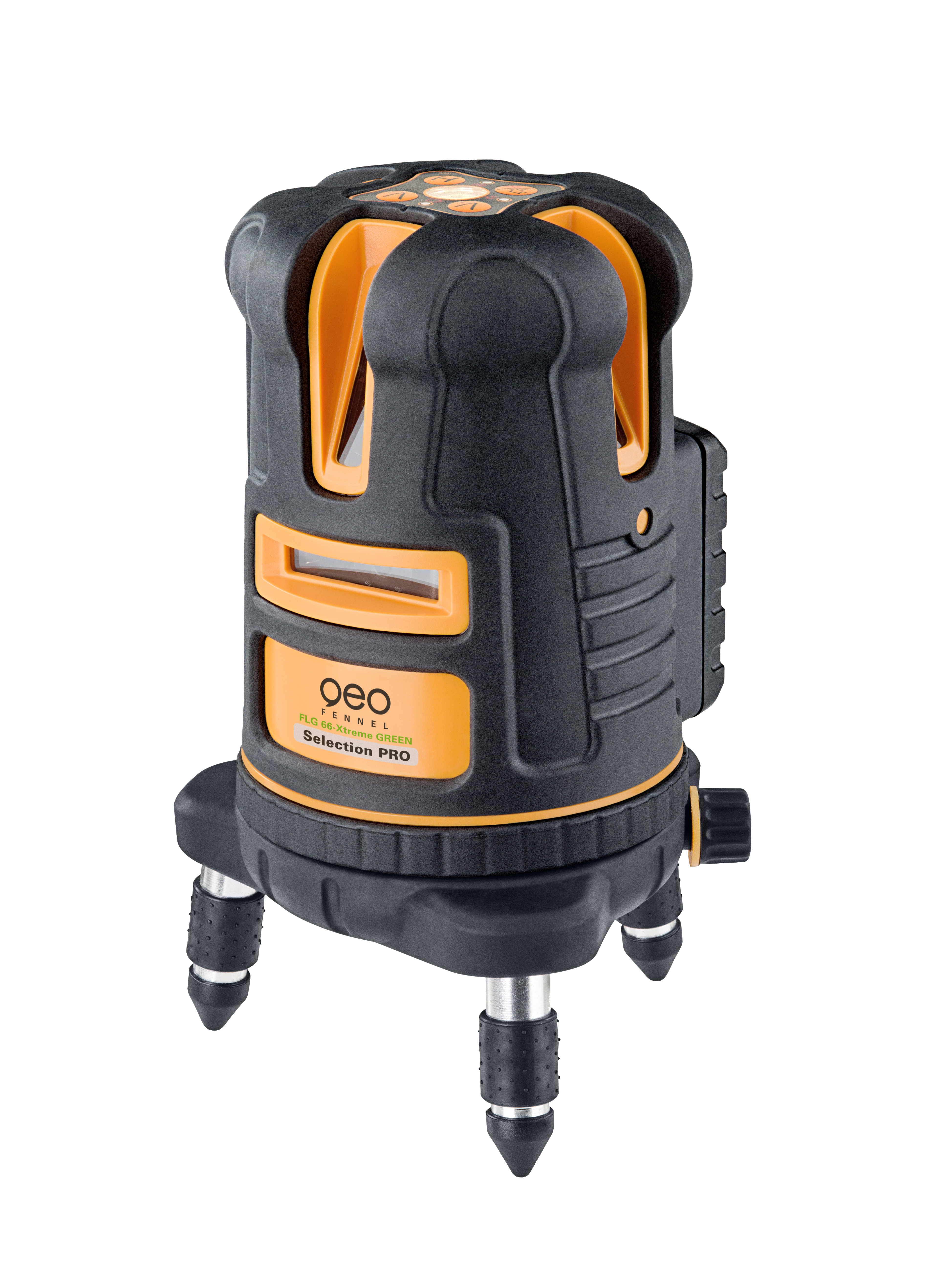 Grön geo-FENNEL självnivellerande flerlinjelaser i Selection PRO-serien. 5 laserlinjer: 1 horisontell 130° och 4 vertikala vinkelräta mot varandra. Laserkors i taket, lodpunkt i golvet. Med finjustering för exakt inställning av de vertikala linjerna. Pulsfunktion för användning med mottagare utökar räckvidden.