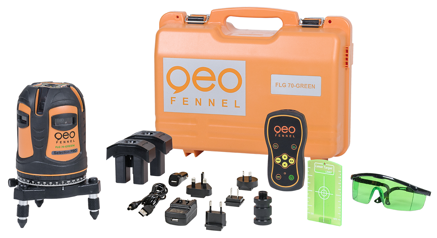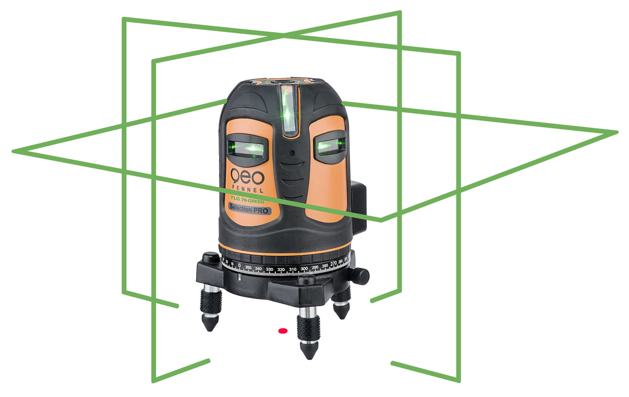 Flerlinjelaser med den senaste gröna lasertekniken, som ger en fin och mycket tydlig linjesiktbarhet. FLG 70 är extremt exakt med en noggrannhet på ± 1 mm på 10 meter. 5 laserlinjer: 1 horisontell 360° och 4 vertikala vinkelräta mot varandra. Laserkors i taket, lodpunkt i golvet. Med finjustering för exakt inställning av de vertikala linjerna. Lasern är särskilt lämplig för uppgifter som kräver att lasern ställs in med laserpunkten över en specifik punkt.