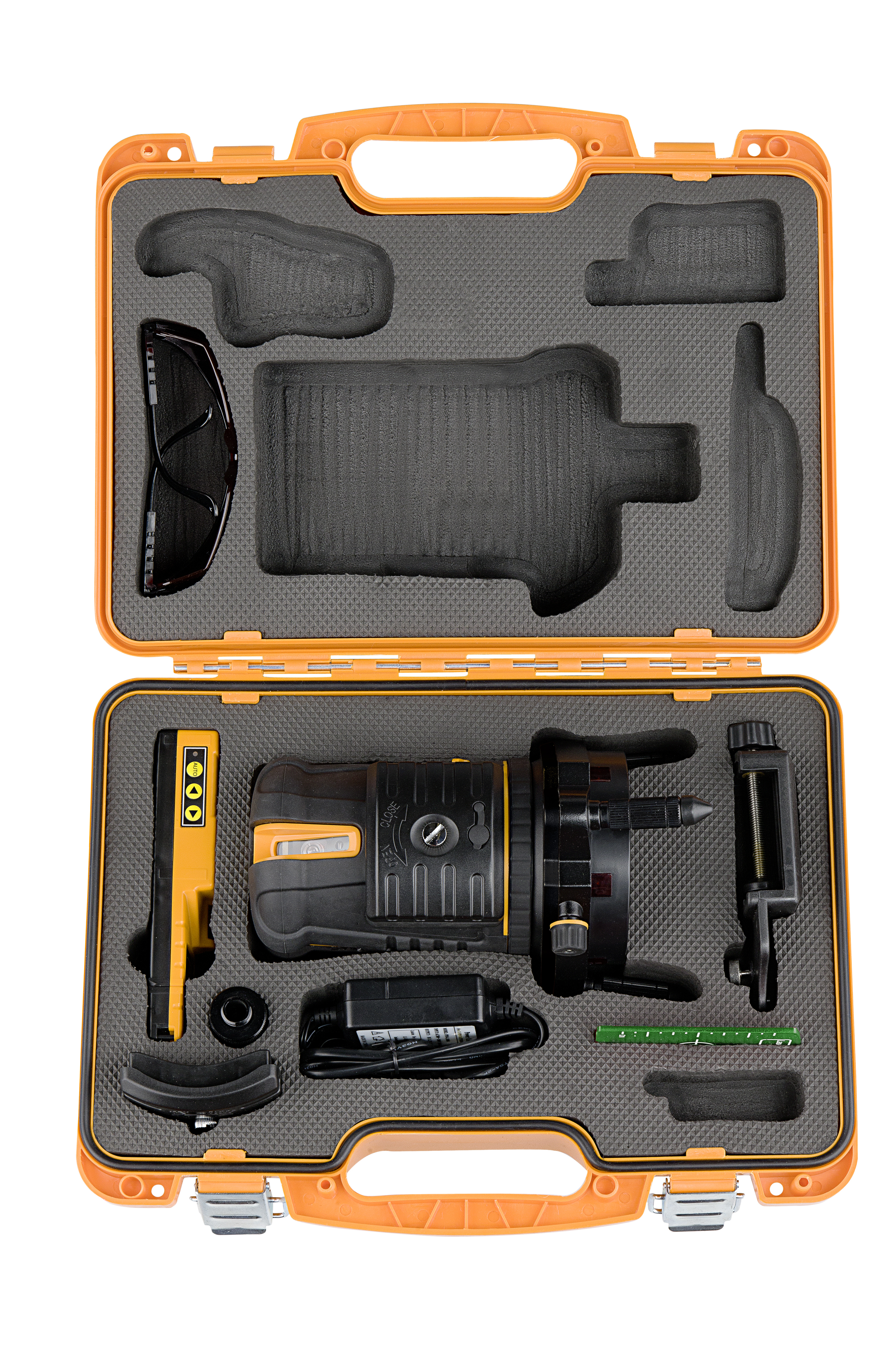 Geo-fänkåls flerlinjelaser med SPÅRNINGSfunktion. Den vertikala laserlinjen justeras automatiskt till mottagarens position i nivå. Denna automatiska justering eliminerar behovet av tidskrävande manuell justering. Lång spårningsräckvidd på upp till 50 m med centreringsnoggrannhet på ±1 mm / 10 m. Senaste gröna lasertekniken med fin och tydlig linjesiktbarhet. 4 vertikala linjer i 90° vinkel mot varandra, 130° horisontell linje, lod uppåt, tvärgående, lod nedåtgående stråle - kan aktiveras/avaktiveras i grupper.