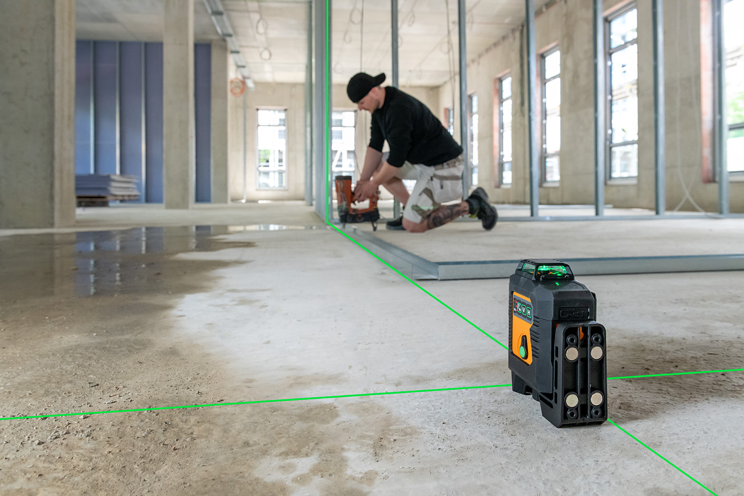 Grön flerlinjelaser med 3 x 360° laserlinjer som bildar 6 laserkors. Lasern är perfekt för en mängd olika nivelleringsuppgifter inomhus, såsom att sätta upp skiljeväggar och undertak, flytta punkter, kakelsättning etc.