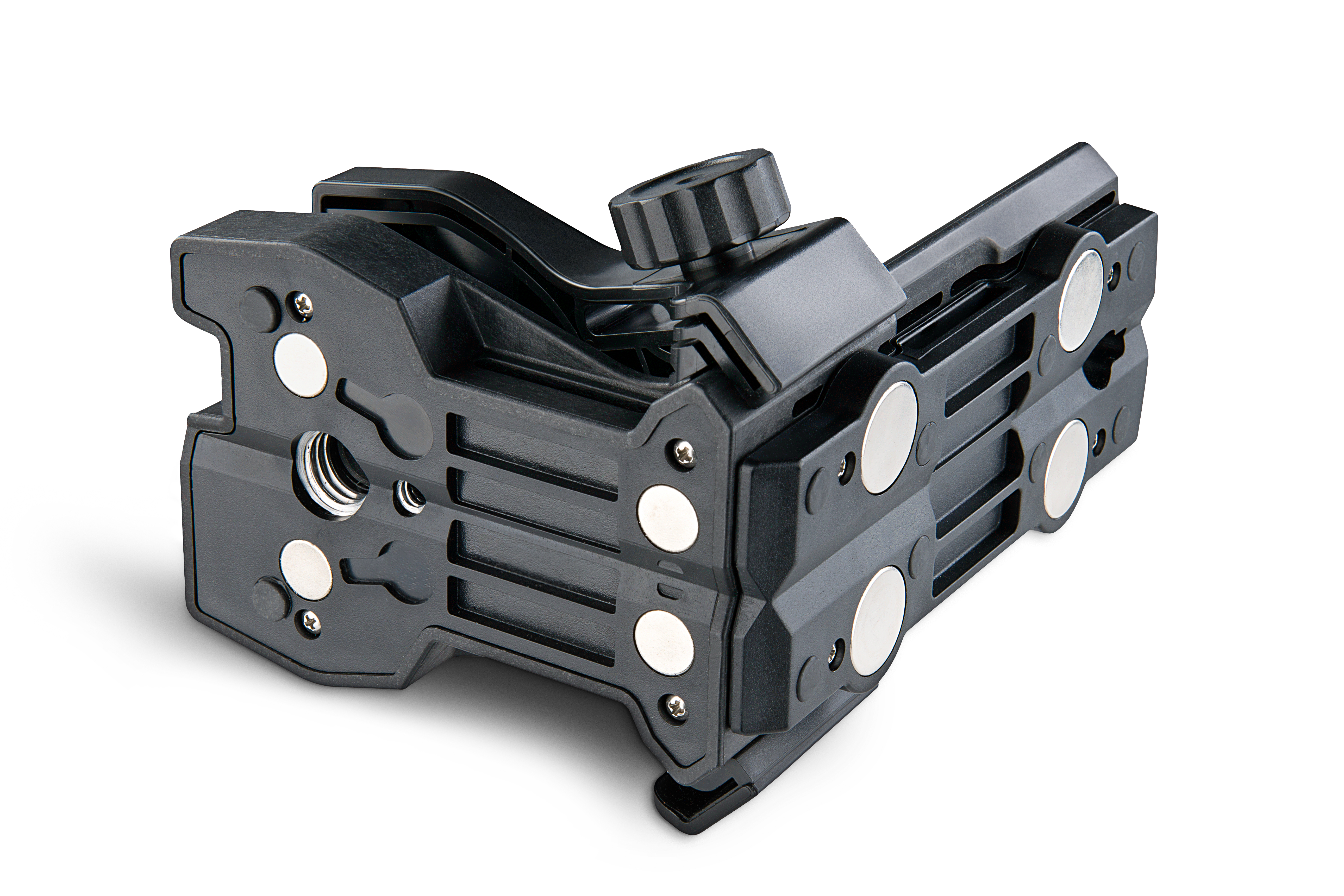 Funktionellt fäste med starka magneter på basen och baksidan. Justerbar höjd. 5/8” gänga för lyftstativ.