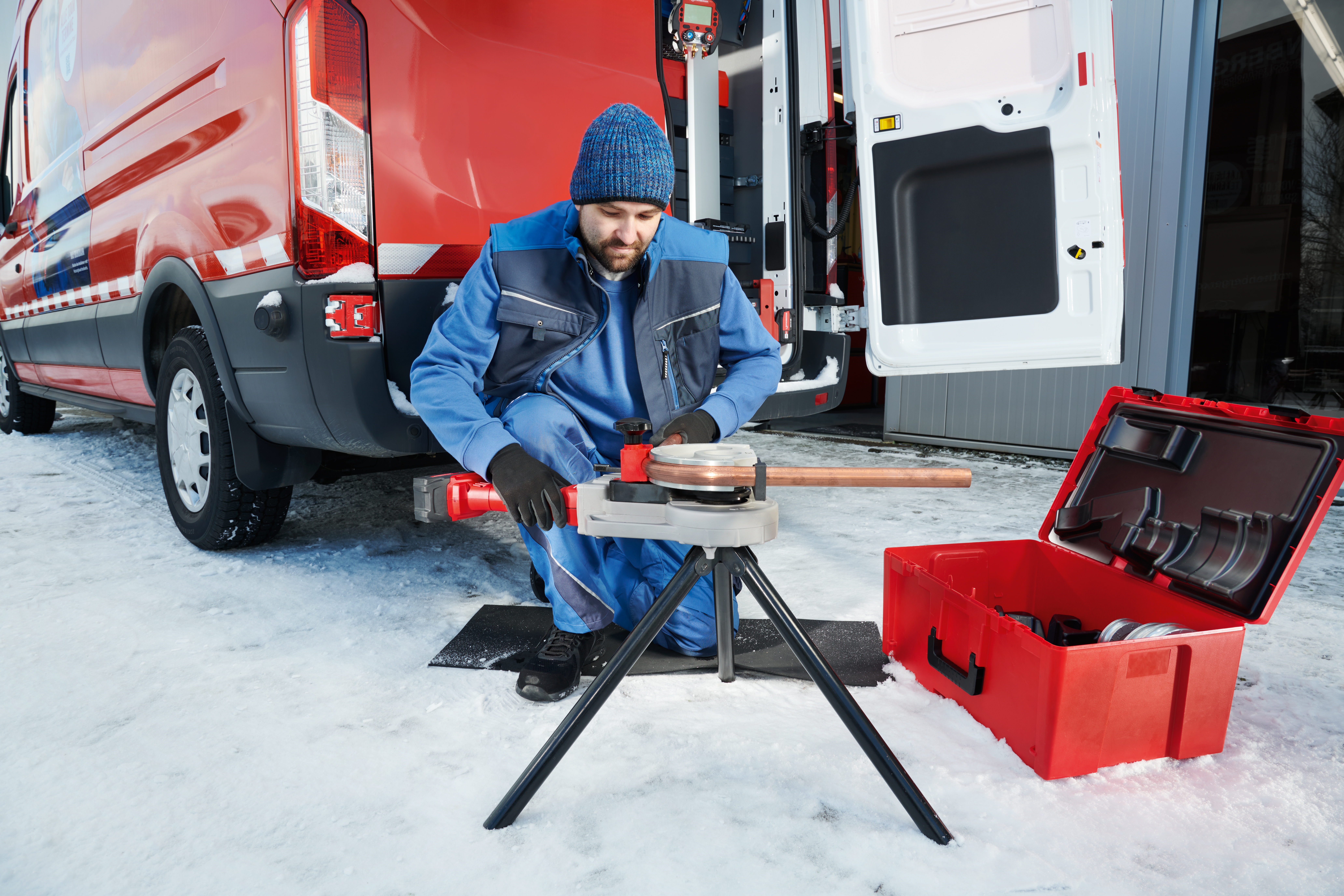 ROBEND 4000 E är en batteridriven bockningsmaskin utvecklad för exakt bockning av olika rörtyper. Den kan hantera koppar-, rostfritt stål-, kolståls- och kompositrör utan problem – och levererar bockningar upp till 180° .