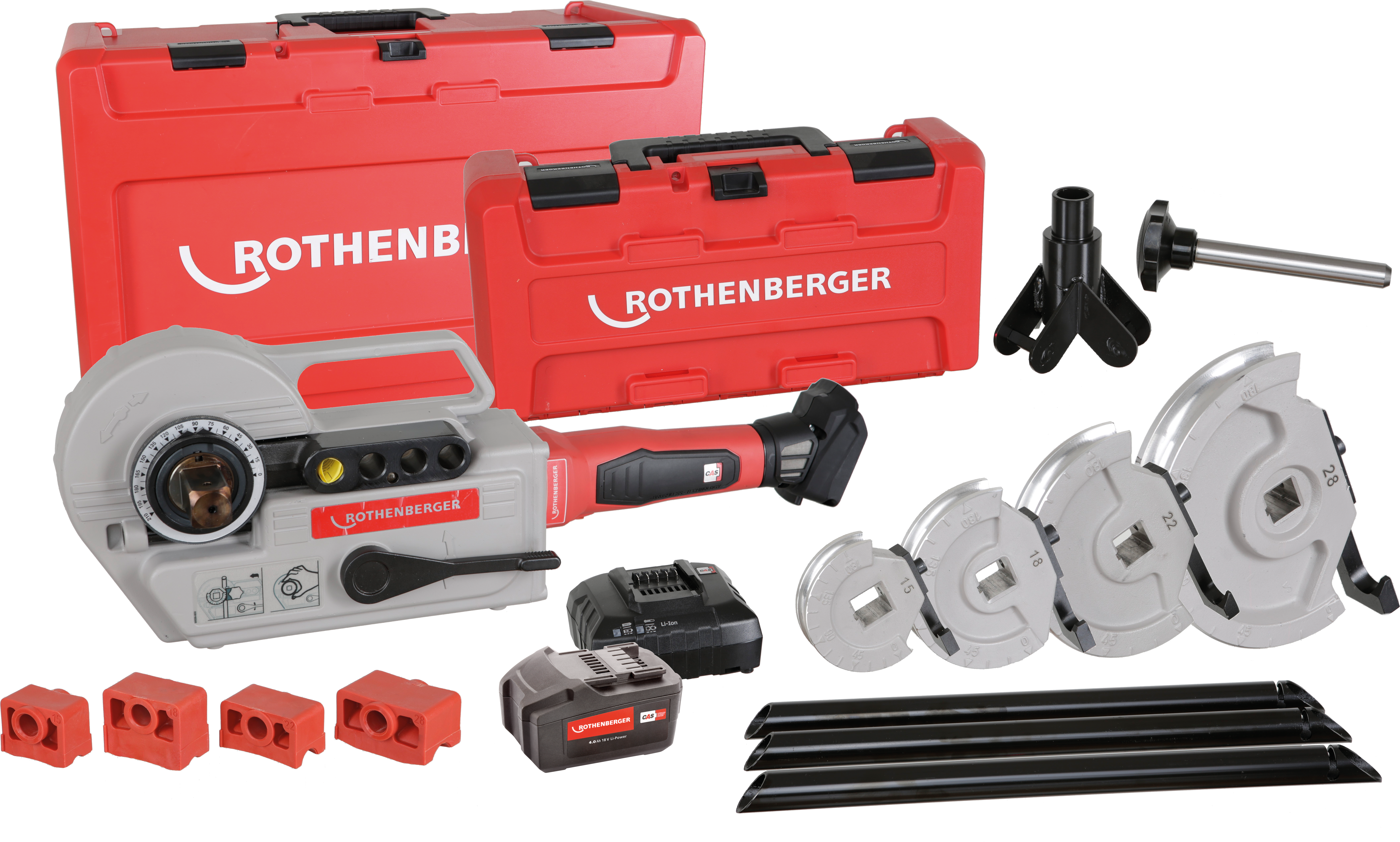 Böjningssats: 15 mm, 18 mm, 22 mm, 28 mm, PROCore 18/4, 4,0 Ah 18 V Li-Power-batteri, laddare 14/36, 230 V, EU, stativ, glidskoaxel, bruksanvisning och ROCASE 6427-väska