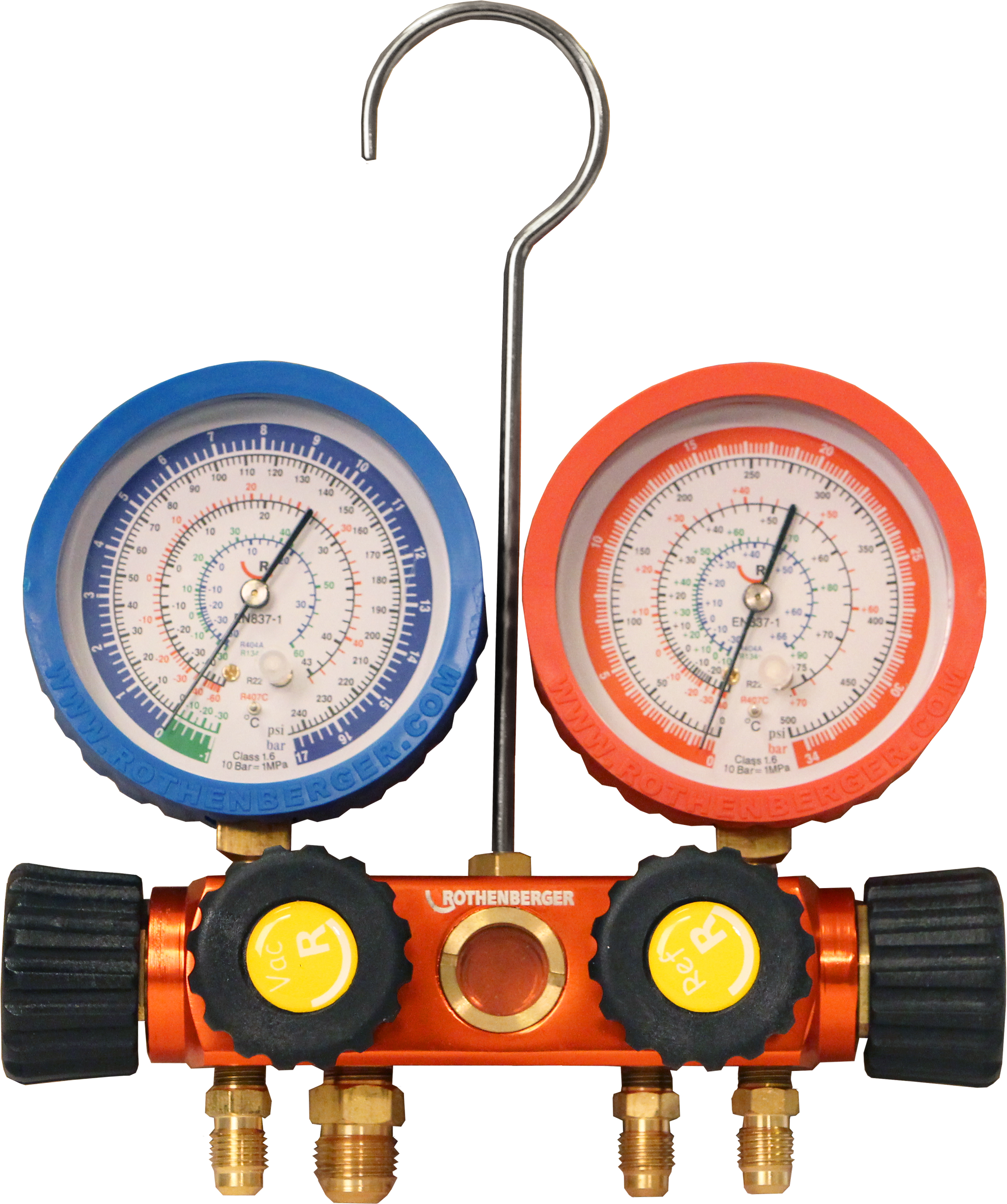Analog 4-vägs tryckmätare 1/4 SAE för kretskontroll vid installation av kyl- och luftkonditioneringssystem samt värmepumpar. För köldmedierna R22, R134a, R407C och R404A.
