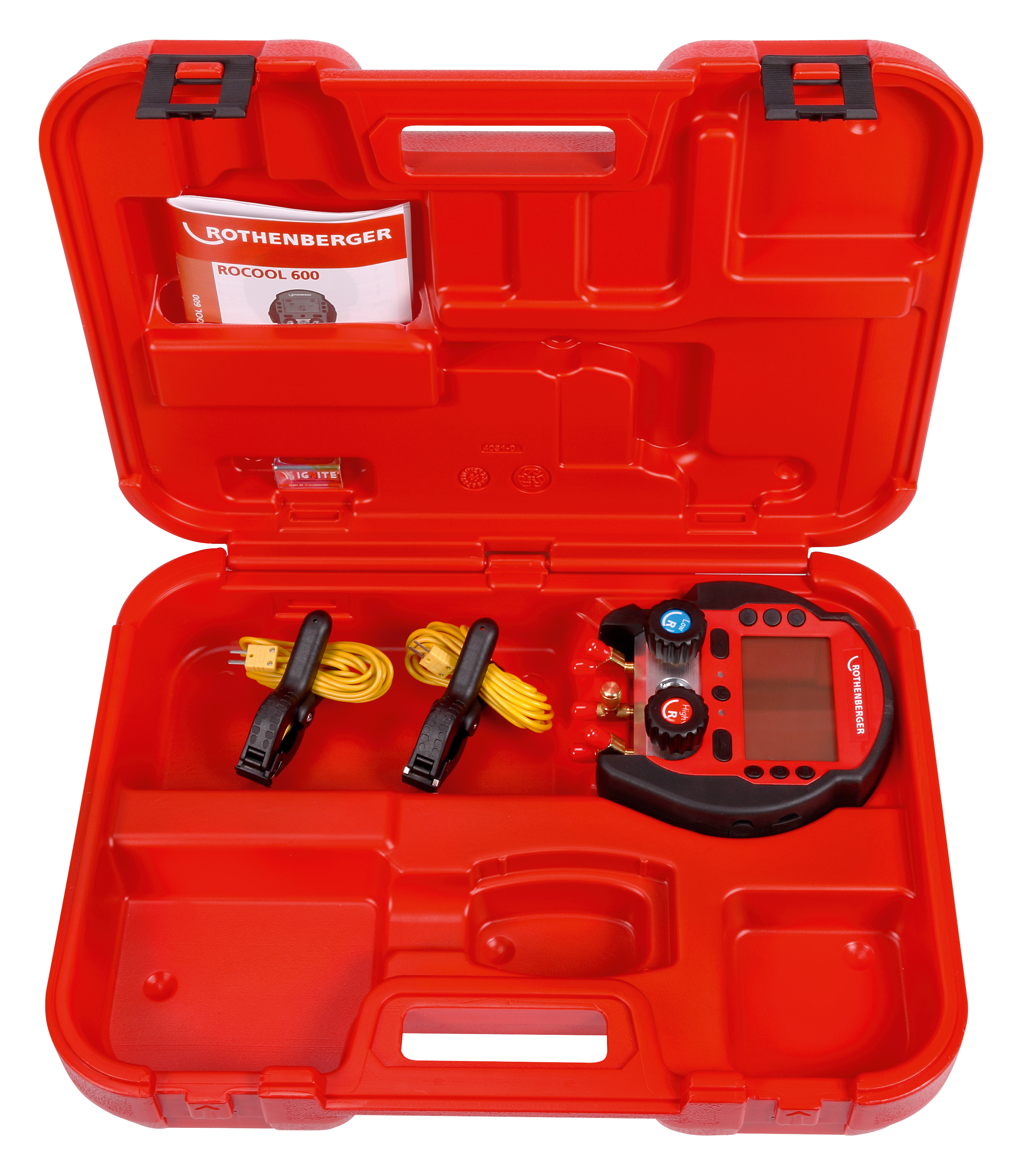 ROCOOL 600 digital tryckmätare för påfyllning, underhåll och dokumentation av kyl- och luftkonditioneringssystem samt värmepumpar. Set bestående av digital tryckmätare och 2 temperaturklämmor för montering på rör upp till Ø 32 mm. Levereras i väska.