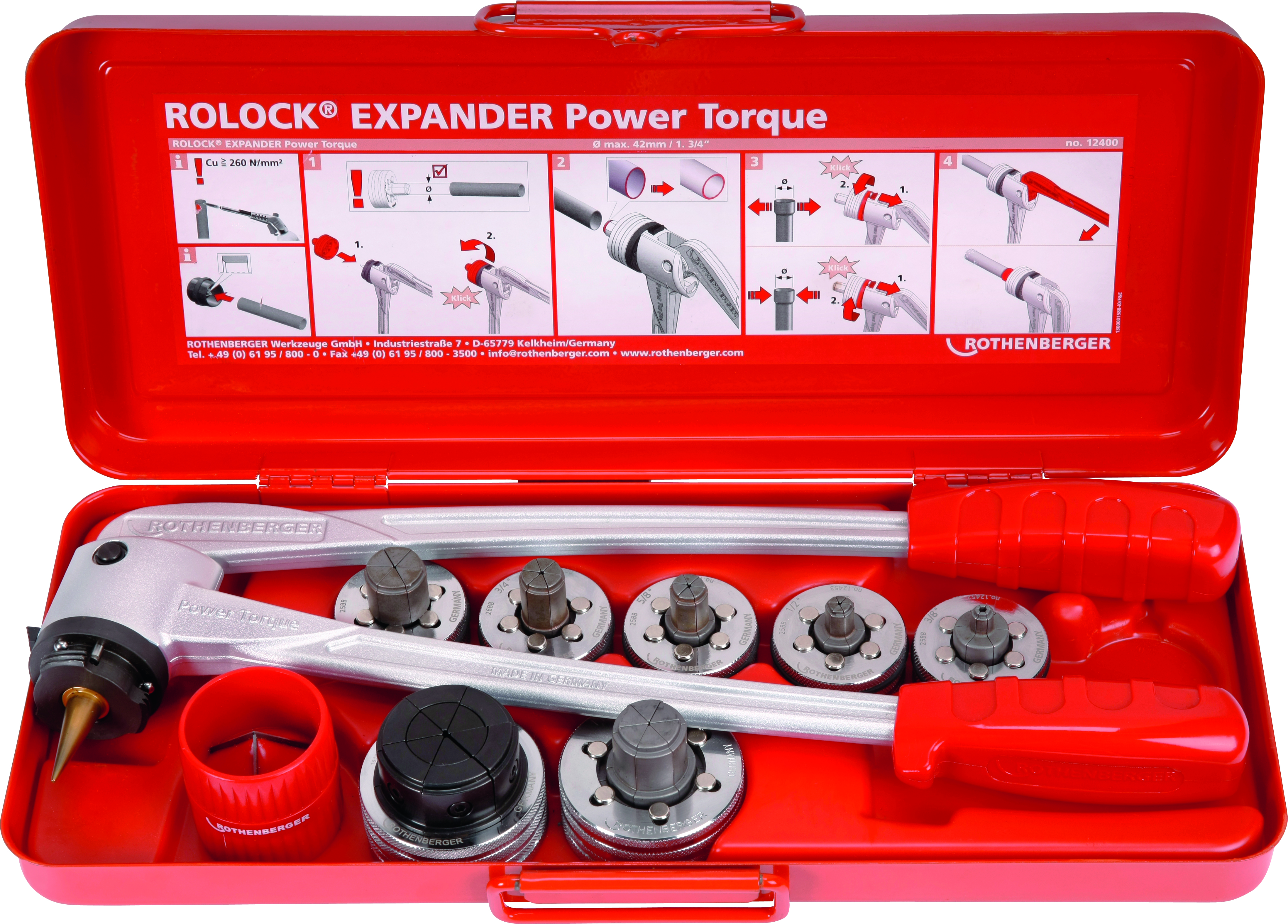 Set bestående av expanderhuvuden, ROLOCK expandertänger, inre och utre gradverktyg, stålhölje och plastinsatser.