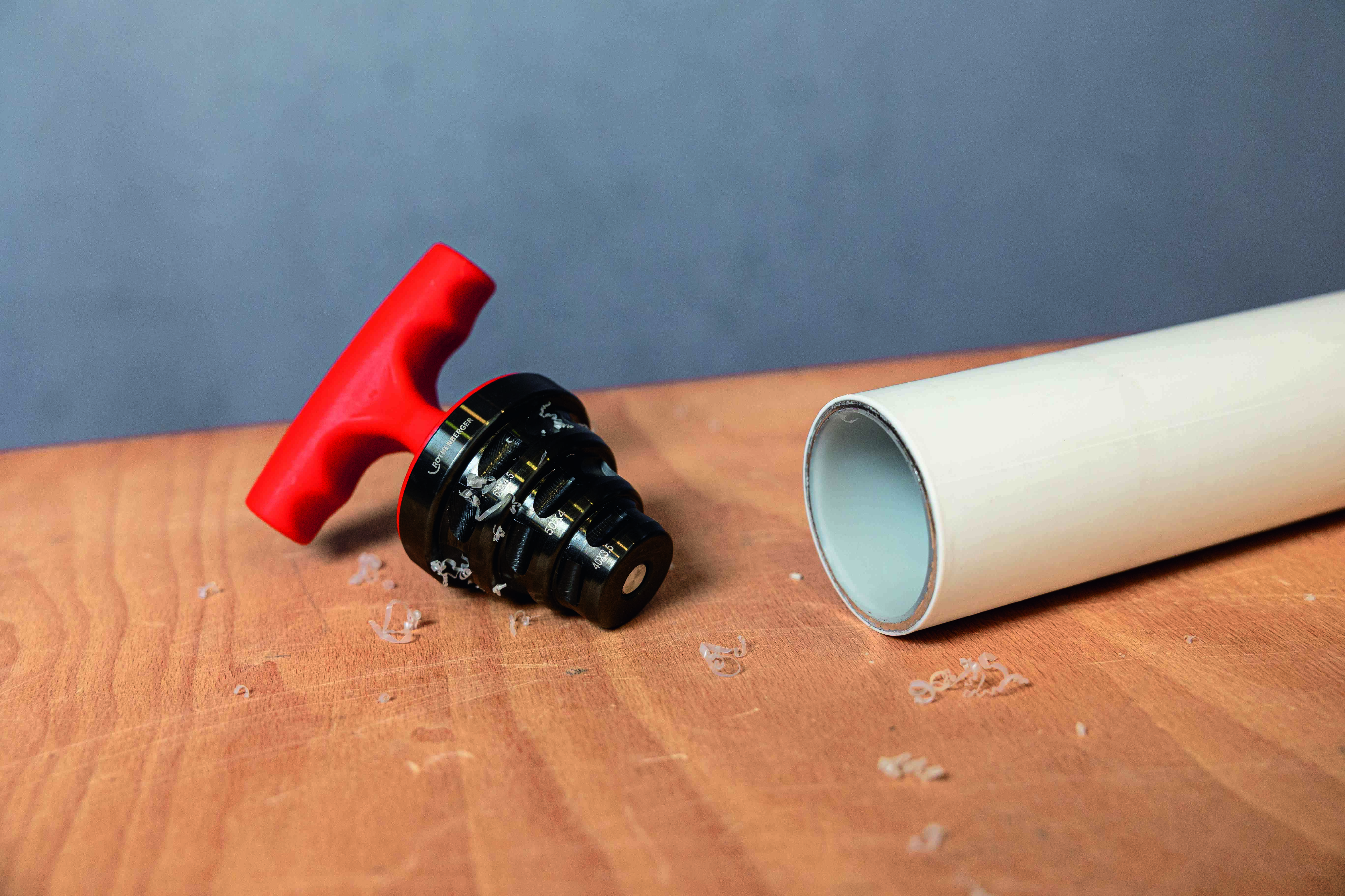 Den integrerede skraldefunktion fra ROTHENBERGER (RO-Ratchet) garanterer bekvem og sikker bearbejdning af plastrør i alle positioner