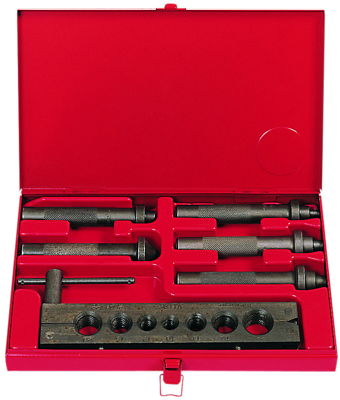 Slagverktyg för plana och 45-graders koniska kragar. Levereras i en metalllåda innehållande: 10, 12, 15, 16, 18, 20 och 22 mm gängor, slagdorn för 90-graders kragar, 4 dorn för plana kragar.